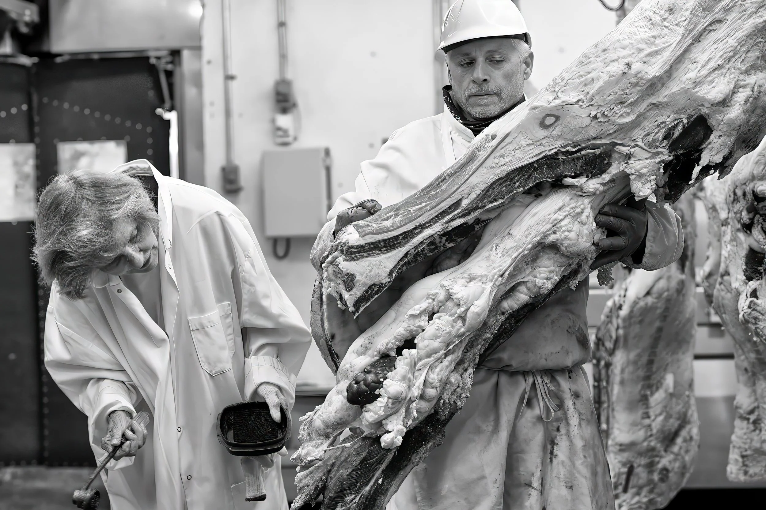 In one frame, two butchers stand quietly among rows of aging beef—surrounded by steel, meeting the camera not as subjects, but as keepers of a process that predates them. In another, the act becomes more intimate: a heavy cut is lifted, examined; its weight both physical and symbolic—before receiving the mark that determines its final destination.